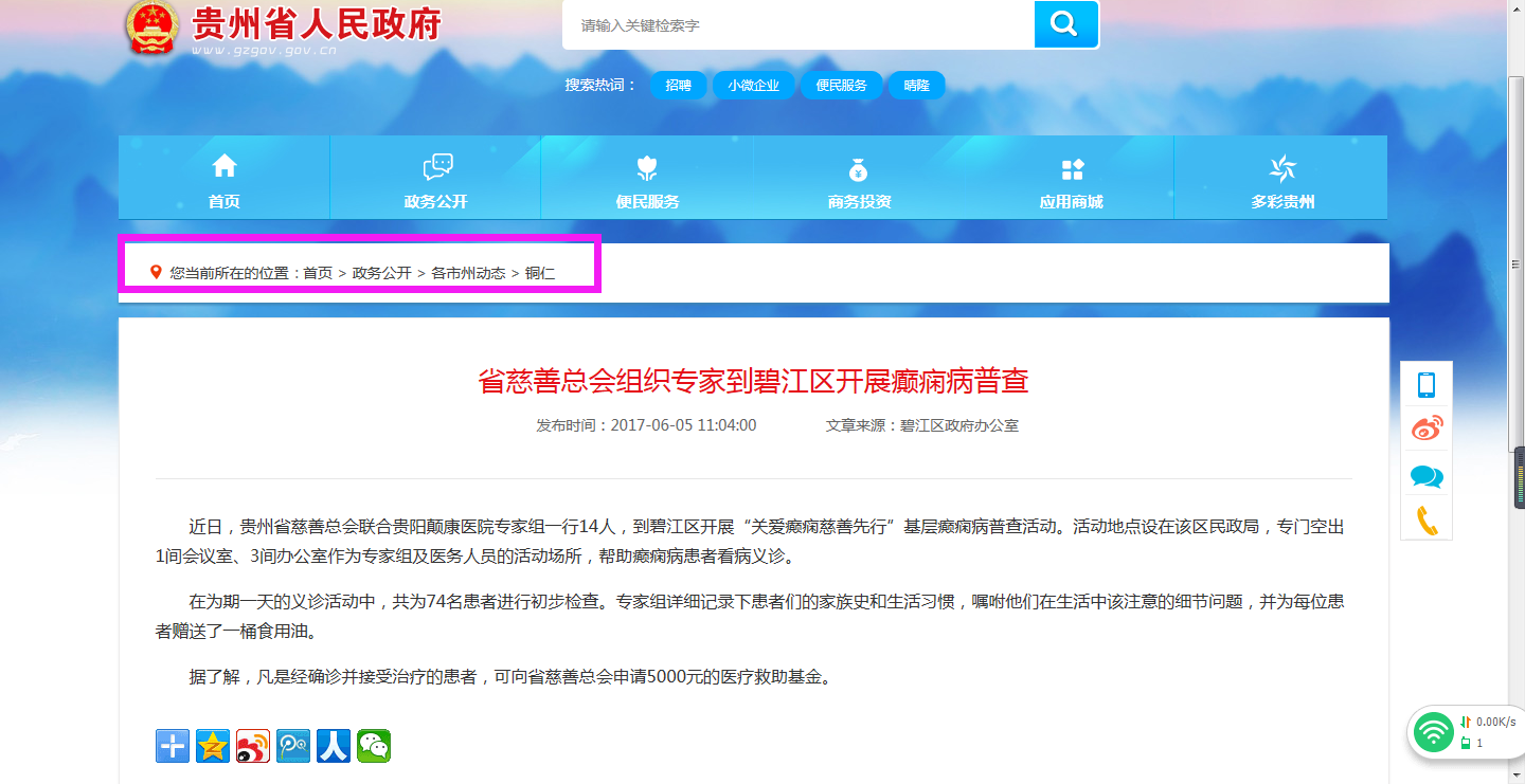 自8月25日起,贵州省慈善总会携我院专远赴贵州省盘州做癫痫普查,现已到达铜仁市碧江区,得到了政府的支持,并将义诊通报刊登在了身政府官方网站政务公开栏目。