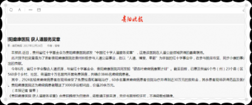 颠康的人道、博爱、奉献,这是颠康不断贯彻党十八大和国精准扶贫政策,而向党作出的庄严执行、而给予人民的健康承诺,受到社会各界人士的肯定、认可,以及媒体的关注追捧。2017年12月24日,贵阳晚报就我院荣获中国慈善高奖章“中国慈善人道服务奖章”事件进行大篇幅的报道,详细论述了我院为贵州人道主义事业作出的强力贡献。