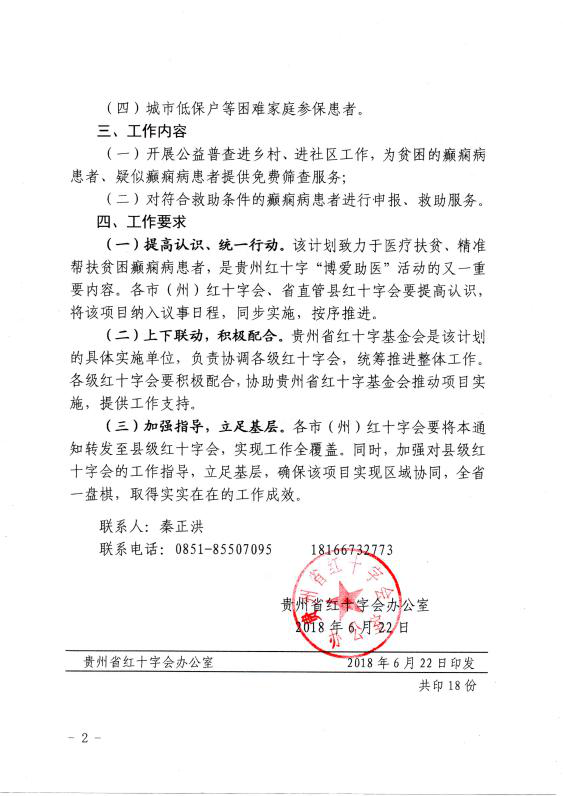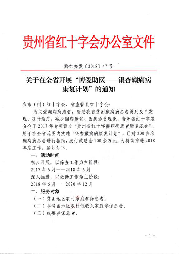 “银杏叶癫痫病控制计划”是由贵州省红十字会联合贵阳癫痫病研究院(贵阳颠康医院)共同开展的健康利民工程,为帮助贵州地区癫痫病患者缓解看病难、看病贵的社会现象,把优质的医疗服务下放,方便基层癫痫患者看病就诊。自成立以来,直面向全省开展癫痫病普查活动,提高癫痫病人、属和公众对癫痫的认识,致力于帮助我省广大贫困、特困及重症癫痫病患者早日摆脱疾病的困扰。为提高癫痫病人生活质量,减轻癫痫病庭生活负担,贫困、特困、重症等癫痫病患者自愿到院治疗,可向贵州红十字癫痫病患者控制基金申请1000—5000元专项医疗救助。