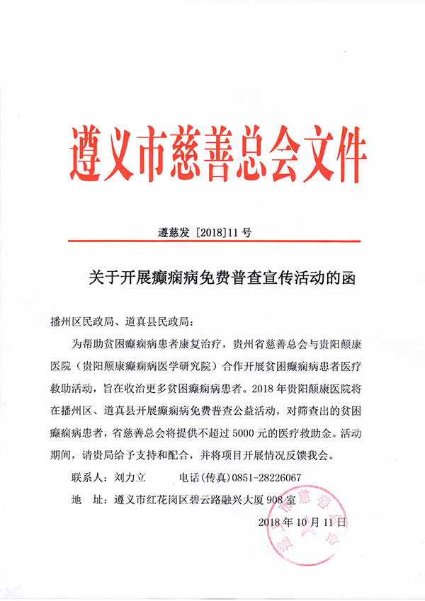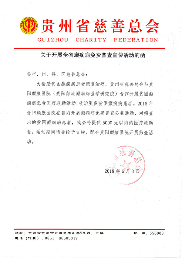 “关爱癫痫·慈善先行全省癫痫病基层免费普查”是由贵州省慈善总会、贵阳癫痫病研究院(贵阳颠康医院)共同开展的健康利民工程。自成立以来,直面向全省开展癫痫病普查活动,提高癫痫病人、属和公众对癫痫的认识,致力于帮助我省广大贫困、特困及重症癫痫病患者早日摆脱疾病的困扰。贫困、特困、重症等癫痫病患者自愿定点医院治疗,可向省慈善总会癫痫病控制基金申请1000—5000元专项医疗救助。
