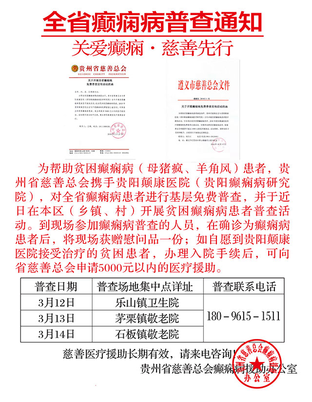 为帮助贫困癫痫病(母猪疯、羊角风)患者,贵州省慈善总会携手贵阳颠康医院(贵阳癫痫病研究院),对全省癫痫病患者进行基层免费普查,并于近日在本区(乡镇、村)开展贫困癫痫病患者普查活动。到现场参加癫痫病普查的人员,在确诊为癫痫病患者后,将现场获赠慰问品一份;如自愿到贵阳颠康医院接受治疗的贫困患者,办理入院手续后,可向省慈善总会申请5000元以内的医疗援助。